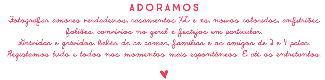 São muitos mais os Dias Felizes e por isso merecem registo. Adoramos fotografar amores verdadeiros, anfitriões foliões, convívios no geral e festejos em particular. Grávidas e grávidos, bebés de se comer, famílias e amigos de 4 patas.